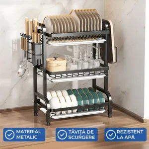 Organizator de Vase pe 3 Niveluri, Metal, Negru Mat, Tavă pentru Tacâmuri Inclusă