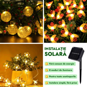 Instalație Solară cu LED-uri, Albină, Flori Cires sau Bilute, Fără Fire, Ideală Pentru Sărbători