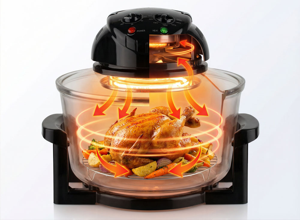 Aerul fierbinte circulă în interior și ajută mâncarea să se gătească uniform, cu mai puțin ulei și fără prăjire clasică.