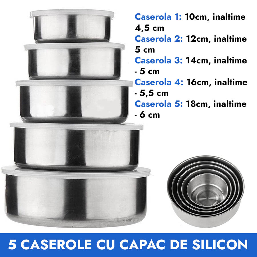și un SET DE 5 CASEROLE DE DEPOZITARE CU CAPAC DE SILICON la doar 24 DE LEI (ofertă unică)